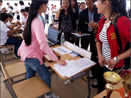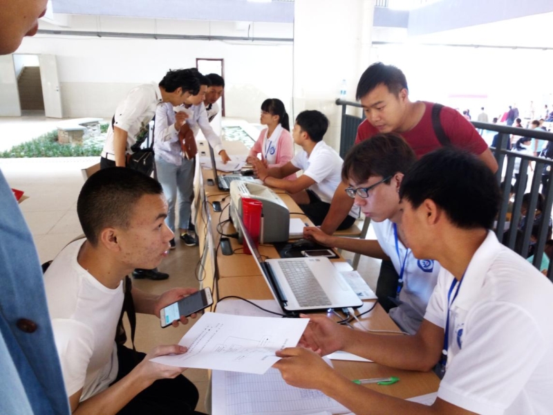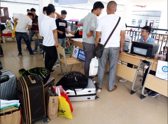 然而面对大家的是一系列没有面对过的问题,不知道财务室怎么走?身份证没带怎么办?没有登记就走了找不到人了,寝室里面明明是四人间怎么住了五个人?为什么我们寝室不够住?一系列的问题摆在带队老师和同学们面前,没有别的办法只能一一去解决,个个去摆平,没有为什么,同学们好像不知道疲惫,都在积极的去面对,如果说明德是一个家,那这个家庭里面一定是幸福快乐的,因为有这些同学在坚持着,面对着,解决着。中午十二点,新来的同学越来越多,报名还在继续,吃饭时间都在往后压缩,看见大家一边吃饭一边帮同学们办理入学手续,内心是由衷的的敬佩他们。