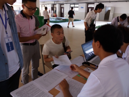 经过昨天的迎新洗礼,迎新同学们在业务操作上已经很熟练了,分工明确,目标一致,都希望今天可以为新来的同学留下一个好的印象,也希望他们早点完成入学手续,真正成为明德学院的一员,吃过早餐,带队老师为我们开了一个简短的会议之后,就真正开始了今天的迎新之旅