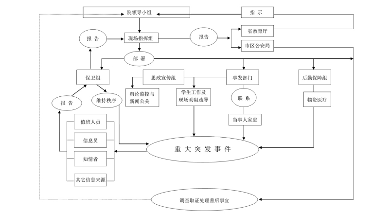(一)学院成立社会安全突发事件应急工作领导小组(以下简称院领导小组),组长由院党委书记、院长担任,副组长由院党政领导班子其他成员担任,成员由院综合办公室、教务部门、人事部门、计财部门、学生部门、后勤总务部门、保卫部门、工会、团委、培训中心、医院、后勤集团主要负责人、事发(部门)单位应急工作领导小组组长组成。院领导小组办公室设在院综合办公室。院领导小组设立现场指挥组,下设保卫工作组、思政宣传组、后勤保障组。