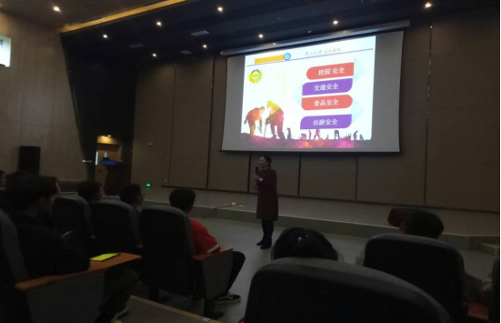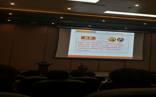 随后谢静副院长开始正式讲话,为全体新生讲述了应该注意的四大安全,即校园安全、交通安全、食品安全及出游安全。首先,注意校园安全即要求同学们注意防火防电,不要带易燃易爆物品及大功率电器用品进入学校;其次,注意交通安全即要求同学们不要坐无牌照私家车,不骑摩托进入学校;食品安全即要求同学们不吃三无食品、少吃或不吃垃圾食品;出游安全则是要求同学们出游要带好必须用品、最好不要单独远游,同时提醒同学们出门保管好自己的财物等贵重物品。