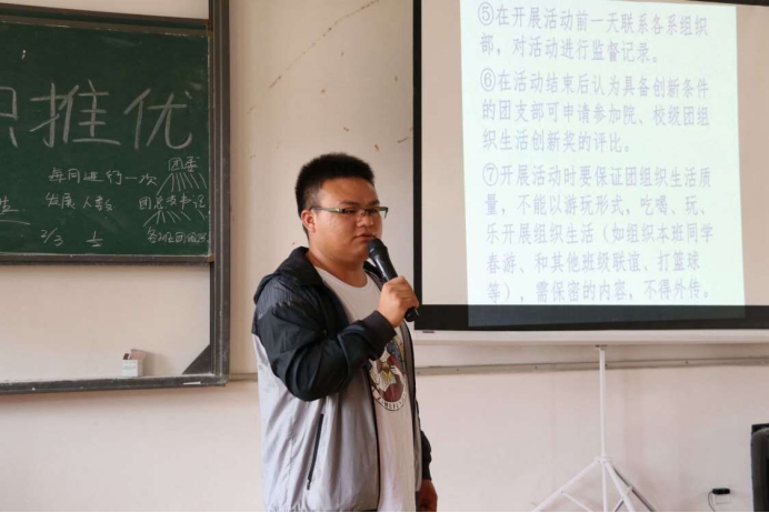 随后,组织部部长陈亮上台介绍团支书培训的内容,讲解发展新团员流程,团组织生活的开展,团组织生活的评比要求,团校团干培训的要求以及推优具体程序。各班级团支书向部长提出相关问题,部长一一为各班团支书解答。最后由部长宣布此次活动结束,请同学们有序离场。