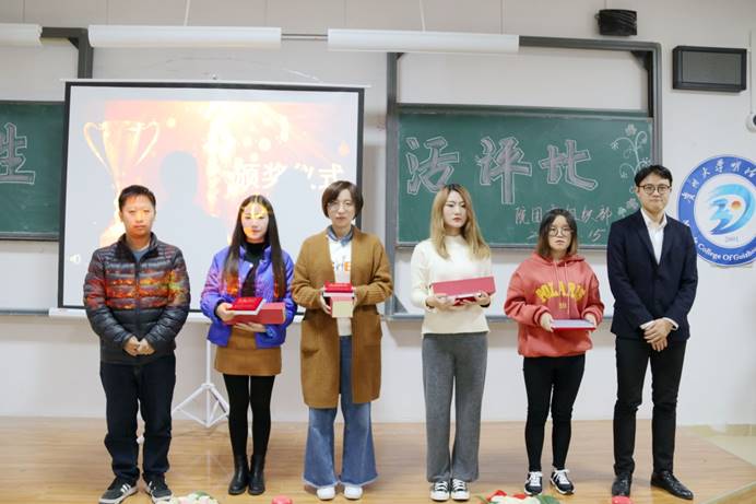 第二组分别是公事1701,数艺1803,行管1602,各位解说员通过PPT向同学们展示了中华传统文化和班级活动,此次活动同学们受到文化的熏染,了解到了开展班级活动的意义。最后管理系主席团鲍芳点评:手工艺品体现出同学们的心灵手巧,并且活动新颖,此次活动的目的是提升青年团组织建设,加强班级凝聚力。在紧张的计分时刻,张旭和李泽琪为同学们演唱歌曲《当你》,缓解现场气氛。最后主持人宣布最佳解说员获得者是电商1703朱婷和公事1701李林莉,并且第一名由通信1701摘得,第二名由电商1703斩获,第三名由行管1602,公事1701,土木1802夺得。团委肖皓丰老师,土木系江坤老师颁奖。