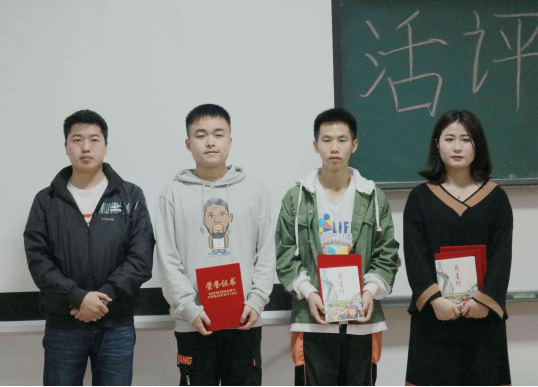 姜波同学对第二组选手作出点评:各班的手工艺品都很不错,但在PPT的文字颜色及选材背景上可以更加完善。接着在计分时段中王承通同学带来歌曲《不再见》。随后主持人公布第二组分数并邀请院团委组织部部长陈亮宣布获奖者。本次活动针对每个班级的人数到达情况进行了扣分规则,最终前三名获奖者分别是:造价1802班、通信1701班、行管1702班。最佳解说员为造价1802班张婷。经管系团总支副书记彭守伙为获奖者颁奖。