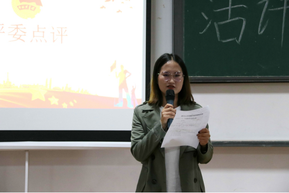 第一组选手解说完之后,彭才敏同学为第一组进行点评:选手都很热情,班级活动都贴合主题,参与度很高,手工艺品精致,但PPT的字体和图片还可以制作得更加精美。在记分时刻,李成欢同学和龙满萍同学带来诗歌朗诵《祖国啊,我亲爱的祖国》。随后主持人公布第一组得分情况。