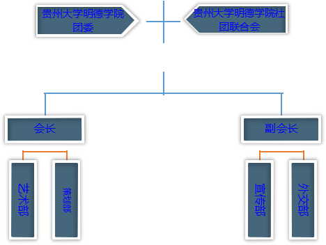 本社团组织机构为社长及各个部,有社长一人,副社长四人,策划部,宣传部,外交部,文艺部组成,各部均设部长副部长一人,干事若干名。社团实行社长负责制:社长团、策划部、宣传部,外交部,文艺部,社长团直接对社长负责,社长直接对院团委负责,并可对下属责任人进行追责。