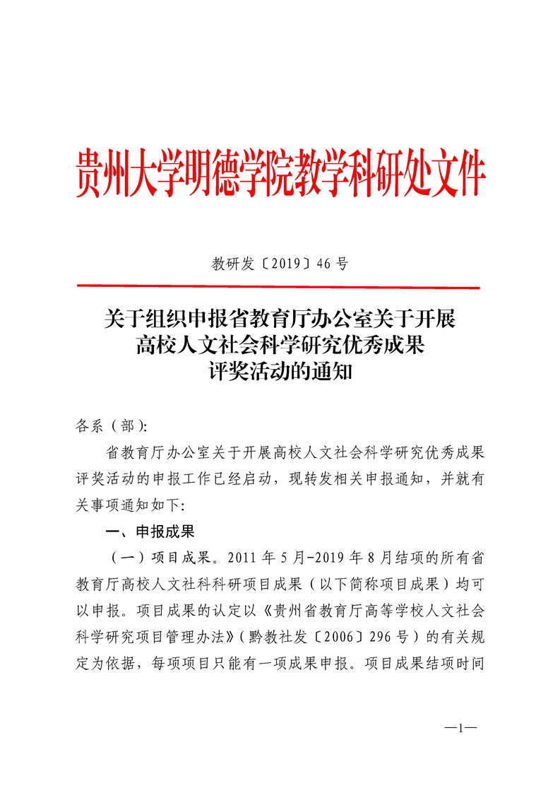 关于组织申报省教育厅办公室关于开展高校人文社会科学研究优秀成果评奖活动的通知