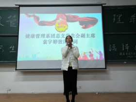健康管理系学生会副主席袁宇婷致闭幕词,她说:感谢同学们对此次团组织生活评比的付出与努力,今天的参赛选手表现很优秀,希望同学们再接再厉,我相信下个月的团组织生活评比同学们会做得更好。