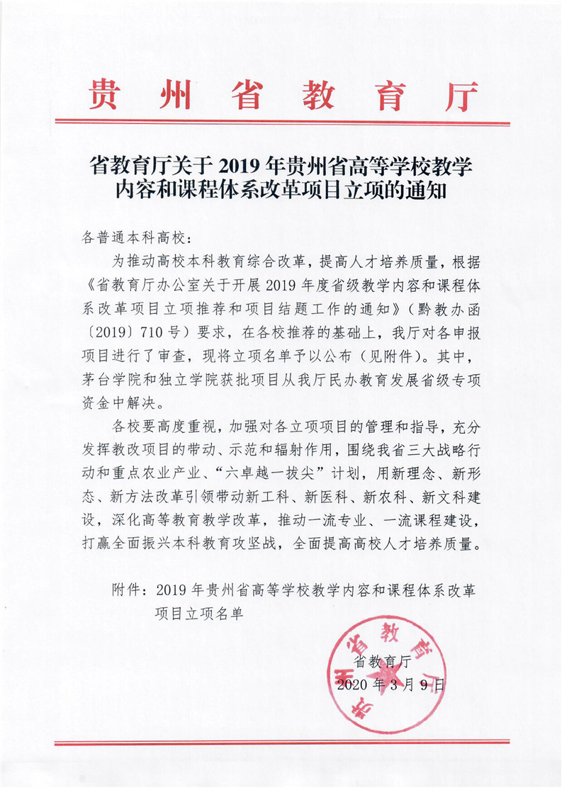 省教育厅关于2019年贵州省高等学校教学内容和课程体系改革项目立项的通知