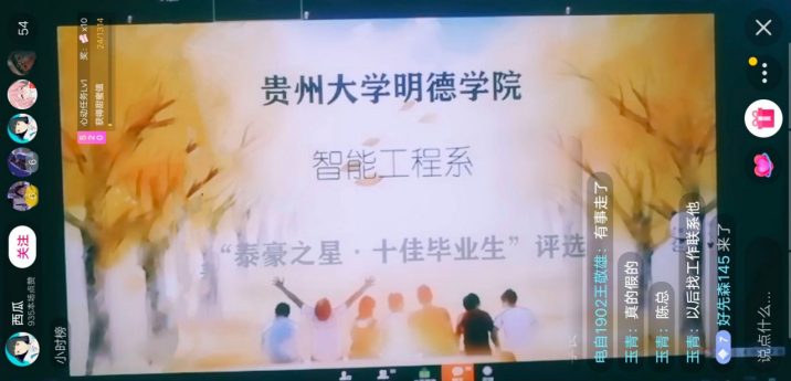以梦为马,不负韶华。像是给我们的青春定义,一直奋斗,不负青春。2020年5月18日下午15:00整,令众学子翘首以盼的智能工程系“泰豪之星·十佳毕业生”评选活动在线上隆重举行。有幸特邀到学生工作处邹倩老师、廖益龙老师、吴海燕老师、教务办公室李元会老师、教研室主任刘轶老师担任评委,张吉林老师、杨波老师、王亚军老师、葛娇老师作为嘉宾,吴娇会、李文涛、黄明艳、漆基伟等作为学生评委,曾明荣、唐尚坤、潘月等同学担任统分员参与本次活动。