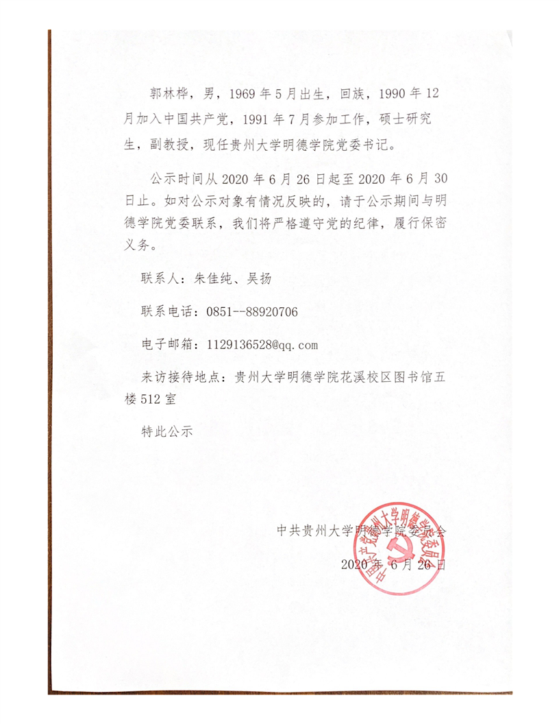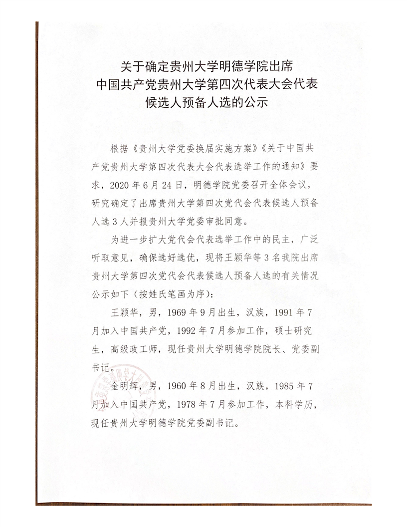 关于确定贵州大学明德学院出席中国共产党贵州大学第四次代表大会代表候选人预备人选的公示