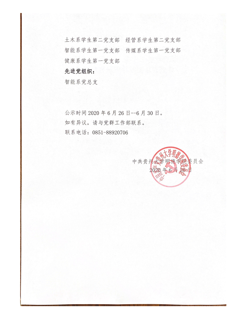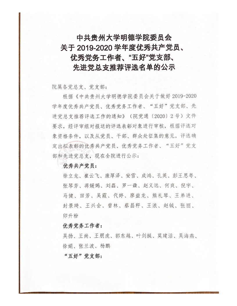 中共贵州大学明德学院委员会 关于2019-2020学年度优秀共产党员、 优秀党务工作者、“五好”党支部、 先进党总支推荐评选名单的公示
