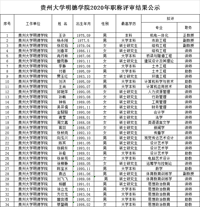贵州大学明德学院2020年职称评审结果公示
