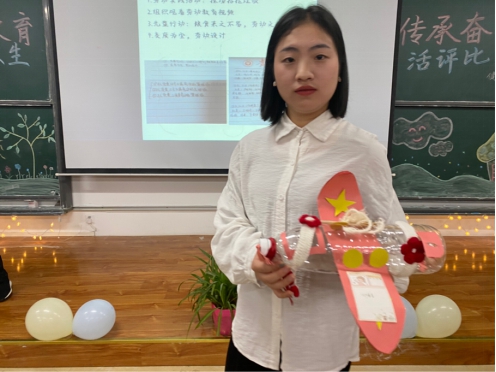 紧接着是第二组参赛班级上台进行解说,他们有的介绍前辈们的劳动成果,有的用他们班级里自己制作的手抄报以及手工艺品来表现出劳动的成果,让大家对劳动更加深入地了解。