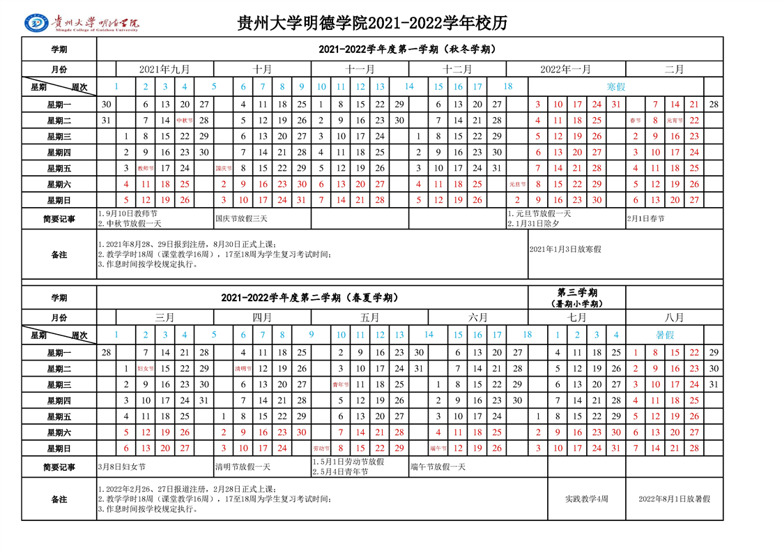 贵州大学明德学院2021-2022学年校历