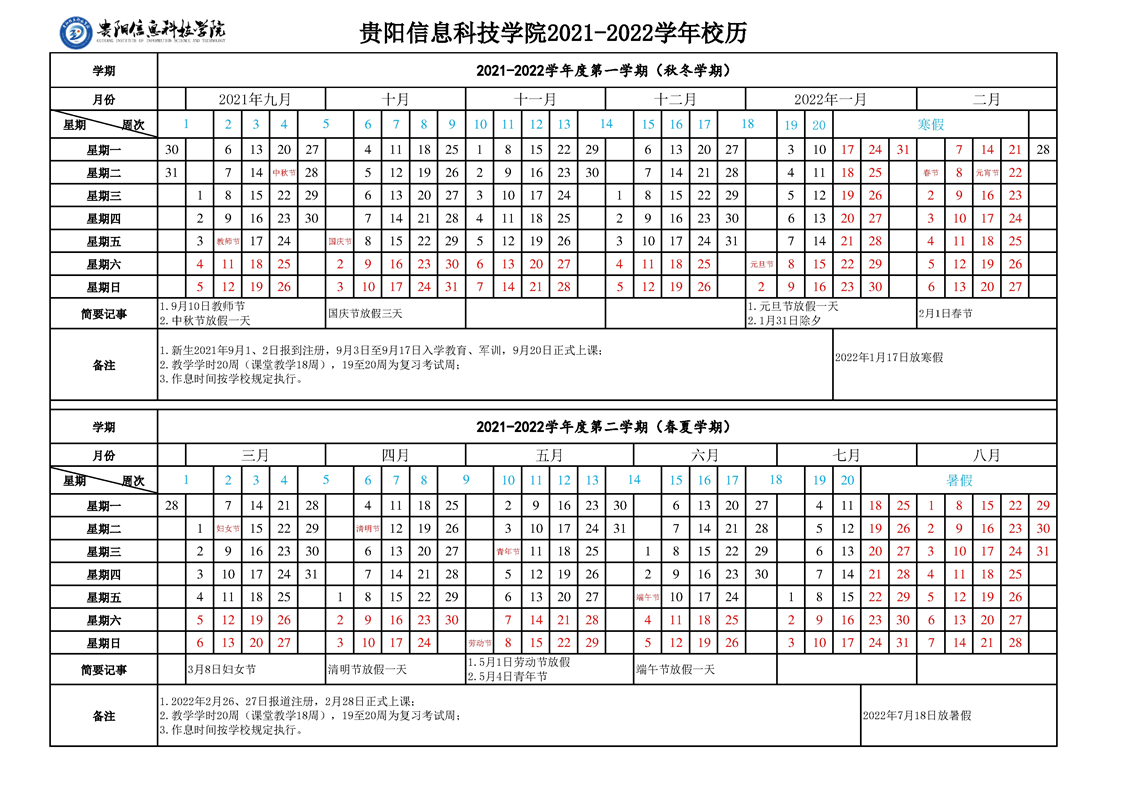 贵州大学明德学院2021-2022学年校历