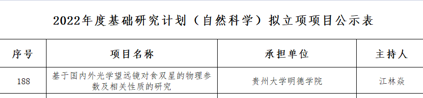 近日,经专家评审及贵州省科技厅2022年厅长办公会审批通过,伟德官网江林焱老师申报的贵州省基础研究计划(自然科学)2022年度一般项目《基于国内外光学望远镜对食双星的物理参数及相关性质的研究》获准立项,资助经费10.0 万元。这是伟德官网首次获得贵州省基础研究计划(自然科学)项目资助项目。