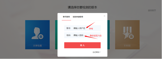 第三步:账号:学号;默认密码:身份证后六位;登录后请及时修改密码和绑定手机号和邮箱。