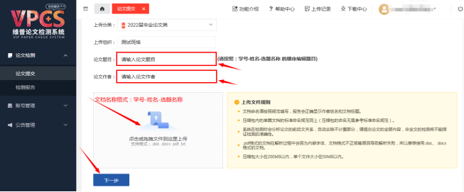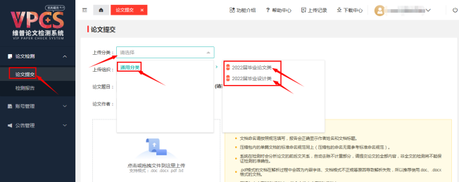 第四步:论文检测——论文提交——上传分类——通用分类——选择论文类/设计类;论文题目、作者,按要求格式输入;上传的文档以:学号-姓名-选题名称命名,下一步;
