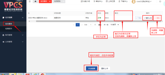 第五步:检查状态为正常;备注为空表示正常,否则点击重新上传;在各系规定上传时间内都可以重新上传;确定无误后,点击手动检测;检测状态为“未检测”表示完成提交,等待检测结果。