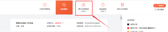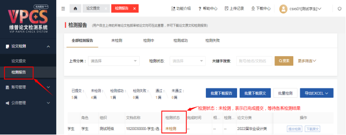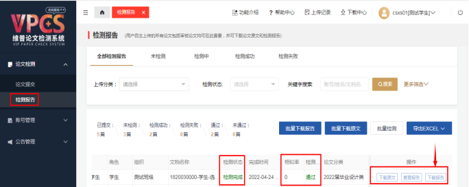 第六步:查看检测报告,检测状态是否完成,相似率,通过状态等,进入答辩环节的学生,及时下检测报告,打印原文对照报告PDF(带贵州大学明德学院水印)上交各系答辩小组进行答辩;简洁报告PDF(带贵州大学明德学院水印)需装进毕业论文(设计)档案资料袋内。
