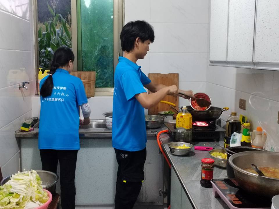 结束了一天的劳动后,后勤小组成员开始准备食材,制作晚餐,看着他们忙碌的身影,充溢着“劳动最光荣”的笑容! 晚饭后,赵翰霖老师召集服务队全体成员开会,总结了当天的工作,再次强调安全问题,并对第二天的行程进行详细安排。随后,团队成员依次自我介绍,让大家能够互相认识互相了解,促进交流,增加感情。