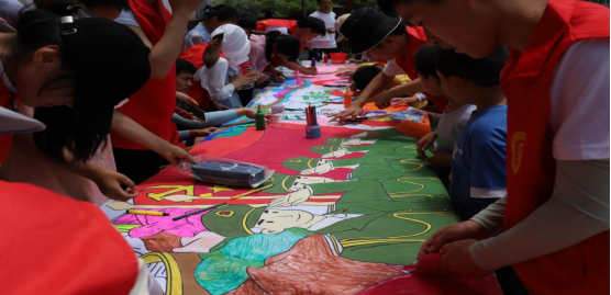 图为小朋友在志愿者指导下完成民族大团结彩绘