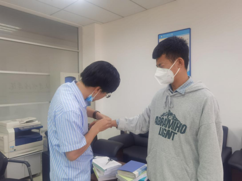 经管系会计学专业余前航同学在学校疫情防控期间,勇担重任、冲锋在前,但因长时间为同学们提供志愿服务,该同学开始感到体力不支、身体酸痛,杨校长知道该消息后立马联系学生,为学生进行针灸治疗,二十分钟的治疗让余前航同学不禁感叹:中华医学博大精深!仅仅半小时后,该同学身体便恢复如常,活力满满!