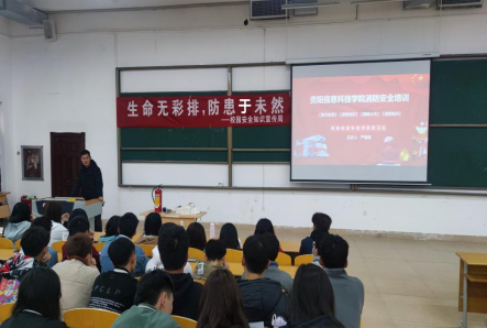 讲座上,严老师结合近期发生的典型火灾案例展开讲解,旨在使学生们进一步加强“财富可以再造,生命不能重来”的意识。主要从火险隐患、应急自救常识、消防器材介绍及正确使用、灭火方法及注意事项等方面,讲解内容有较高的实用性和可操作性。