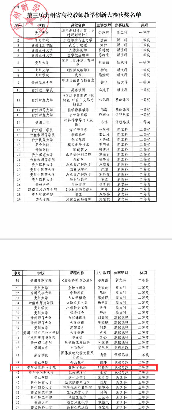 4 月14日-15日, 由贵州省教育厅主办、贵州财经大学承办的第三届贵州省高校教师教学创新大赛圆满收官。经过激烈角逐,伟德官网经济管理系教师邱艳萍团队(成员:曹彩霞、钟杨)的参赛课程《管理学概论》荣获大赛二等奖。