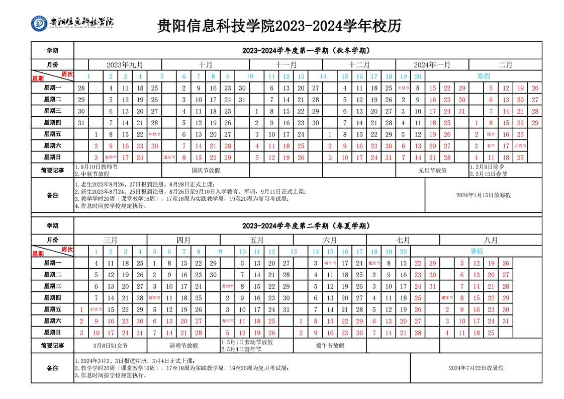 贵州大学明德学院2023-2024学年校历