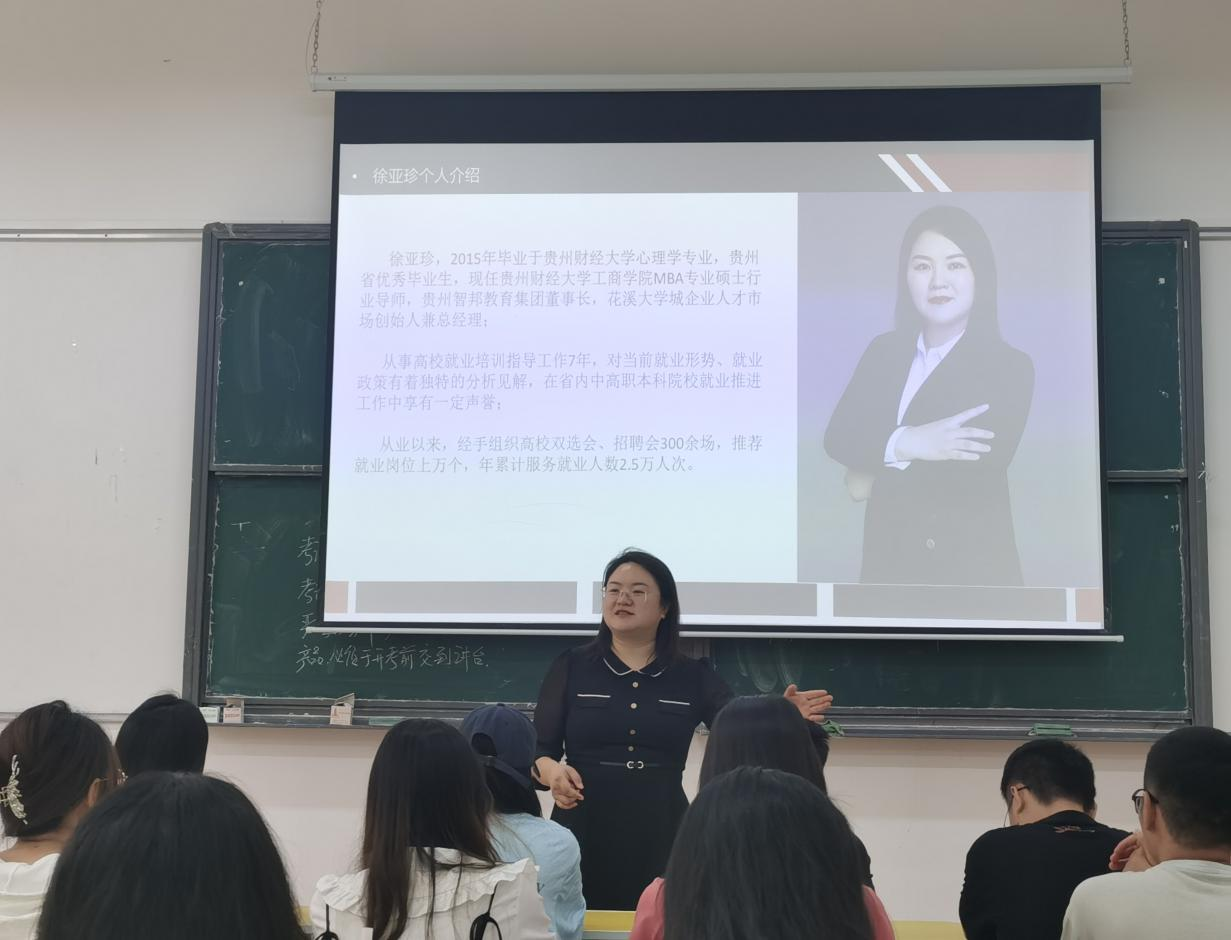新闻网讯(团总支/余鑫 文字/韦雅菁 图片/韦雅菁)2023年6月30日,由贵阳市花溪区人力资源和社会保障局主办、BV伟德中国官方网站经济管理系承办、贵州智邦百佳信人力资源有限公司协办的“花溪区2023高校毕业生就业指导”系列活动于在伟德官网 D102开展。活动围绕毕业生择业心理、简历设计、面试技能提升等系统展开,作为活动的第一次培训讲座,本次讲座由贵州智邦教育集团的创始人、智邦教育集团董事长徐亚珍女士主讲。