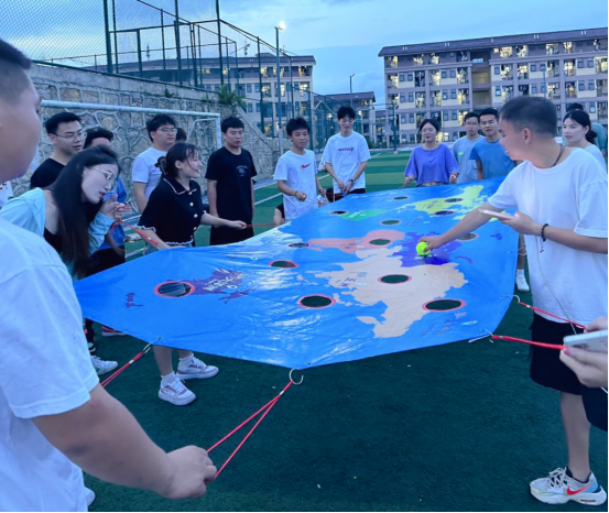 本次活动全班分为5个队伍,全程共6个活动环节,前5个环节为团队游戏,最后一个换节是合唱联谊。活动全程由班长罗晟睿、张艺娴担任主持,综合获胜次数最多的前三支队伍奖励“柿柿如意”陶瓷杯礼盒一份。第一个环节是游戏《不倒森林》,参与挑战的学员围成一个圆圈,每人拿一根彩色塑料管,让棒直立后用右手掌心按住棒的上面,左手放在背后,保持棒直立,在喊“换”时,后一人接住前一人的棒,过程中培养了同学们做事的专注能力。第二个环节游戏为《摸石头过河》,每队派四名选手参赛,每人三块河石,身体的任何部位不得直接触碰除河石之外的支撑物,用时最短获胜。第三个环节游戏为《两人三足》每队两两同学一组,两人并排站立,脚踝以上部分栓绑腿带,协调走至对面标志处折回,再将绳子解下交给下一组队员,用时最短完成的队伍取胜。第四个环节游戏为《百科知识竞答》,由主持人读题,选手作答,卡片正面为题,背面为答案。每队答十题,答对数量最多队伍获胜。第五个环节游戏为《环游世界》,团队成员手拉世界球地图边缘,通过全队配合协作使在世界球按照一定规则路线,从起点到达终点,网球行进过程中不允许掉落,用时最短队伍获胜。