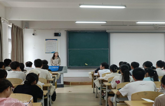 第四节团课:《学习习近平新时代中国特色社会主义思想》,主讲老师:肖蕊。肖蕊老师通过问答方式,现场分析同学们对于时政热点的关注与态度,呼吁同学们要树立正确的世界观、人生观、价值观,积极发表正确言论,鼓励同学们刻苦钻研,为国效力。