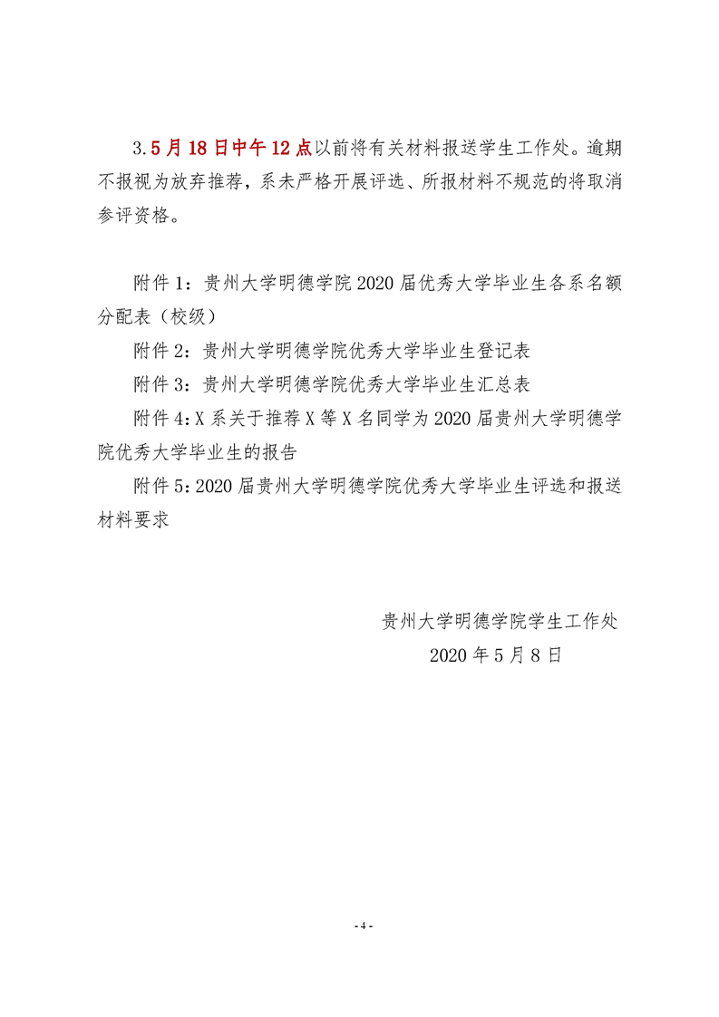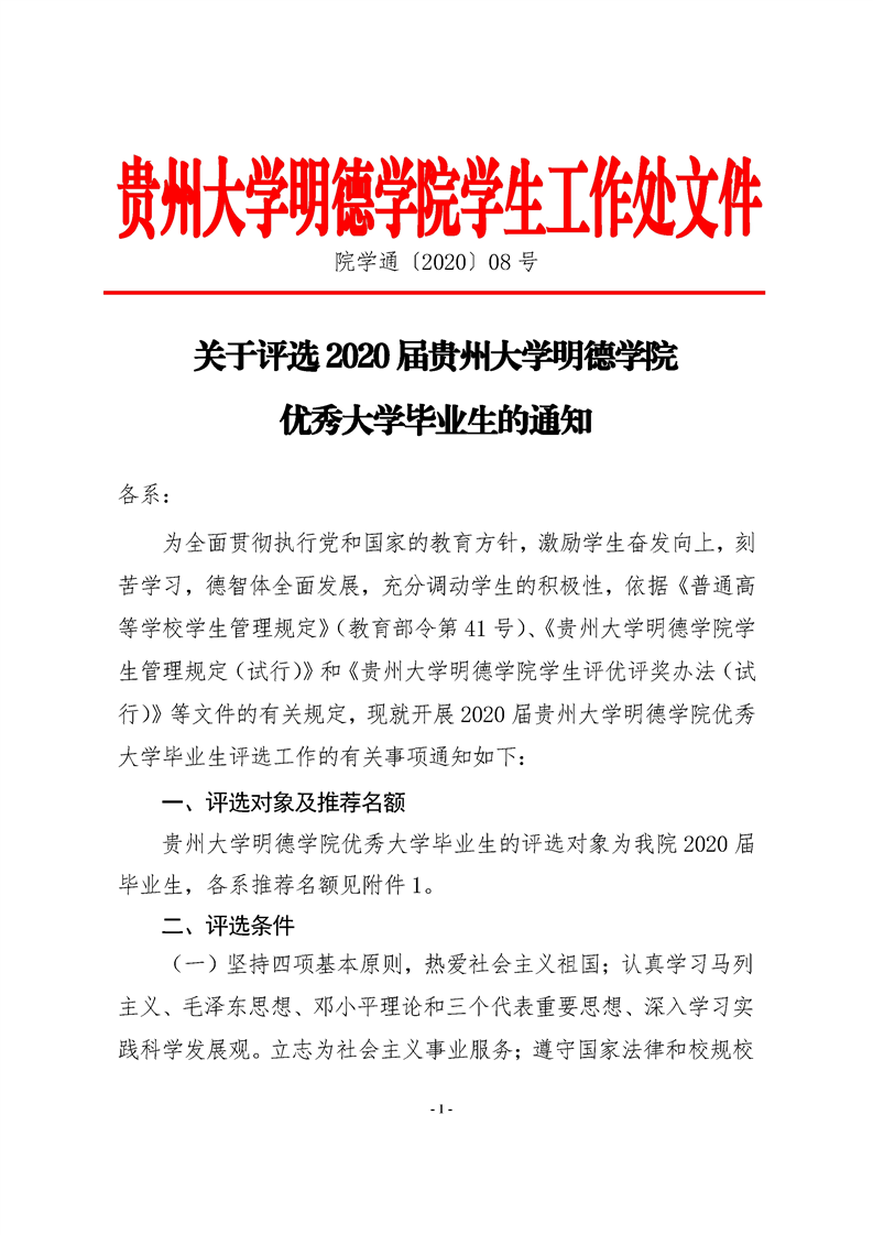 贵州大学明德学院关于评选2020届贵州省普通高等学校优秀大学毕业生的通知