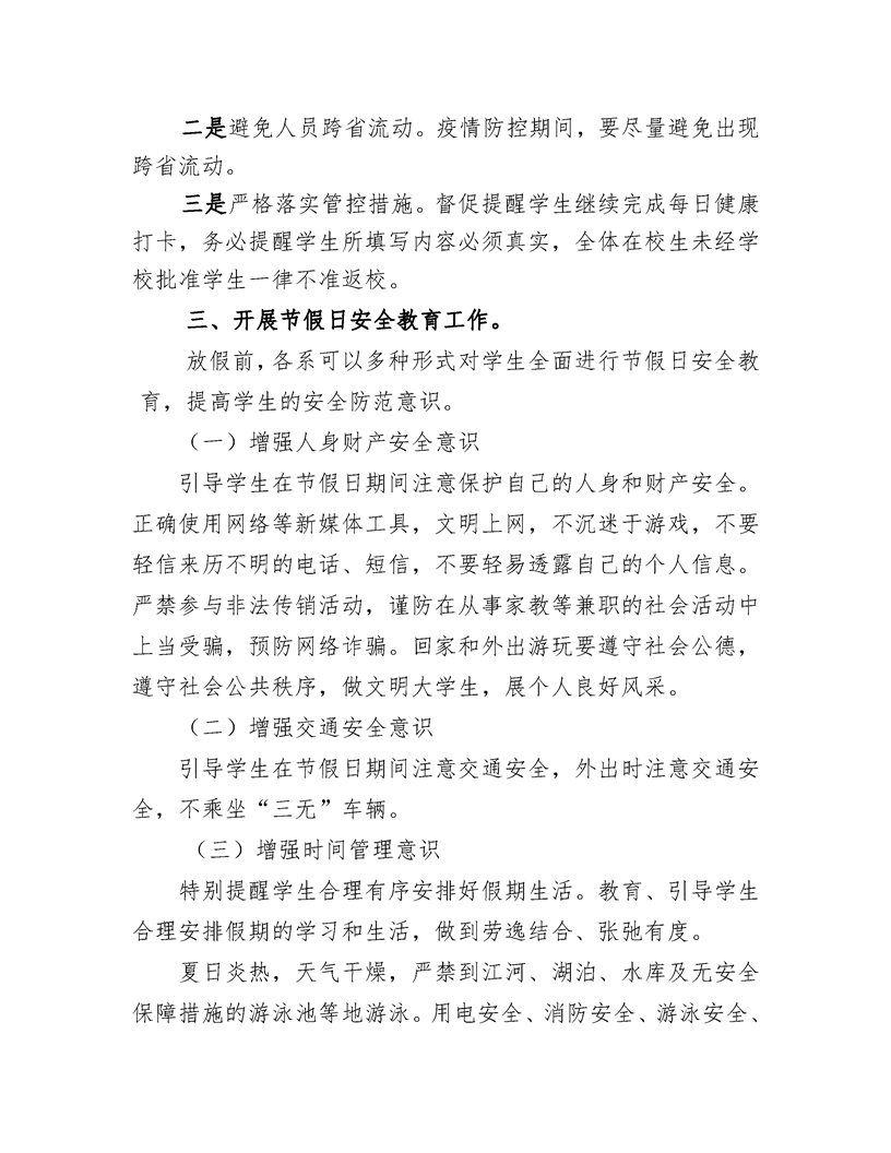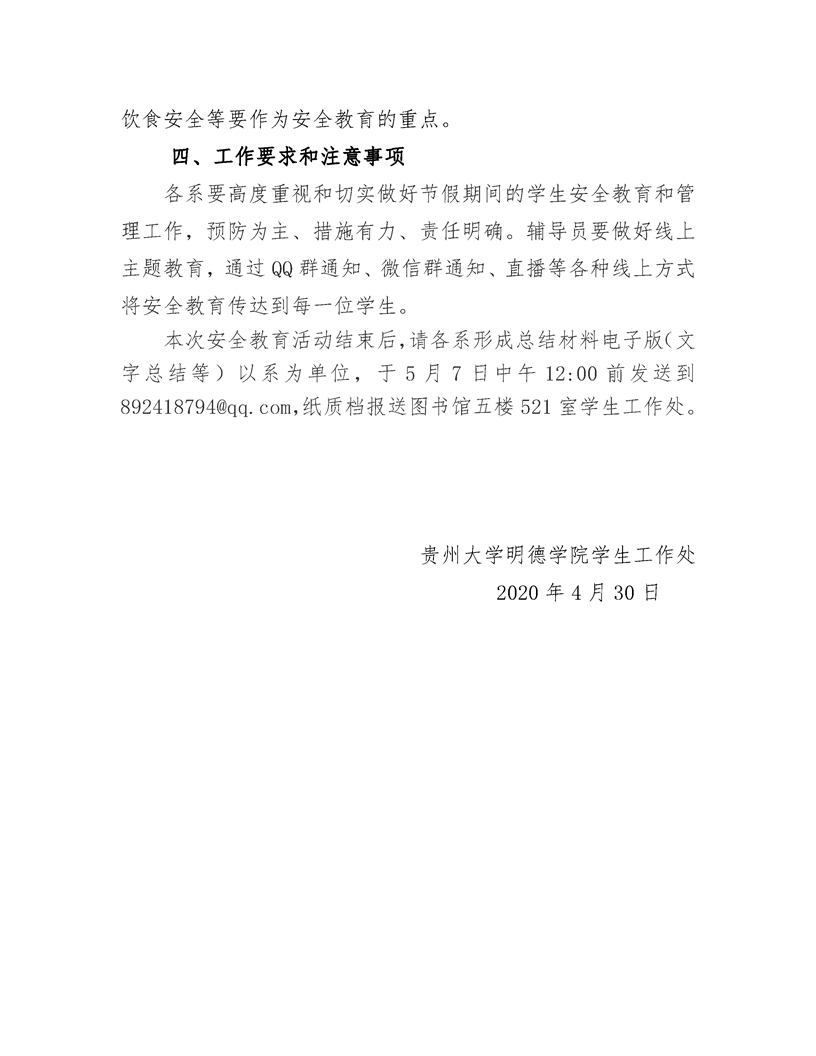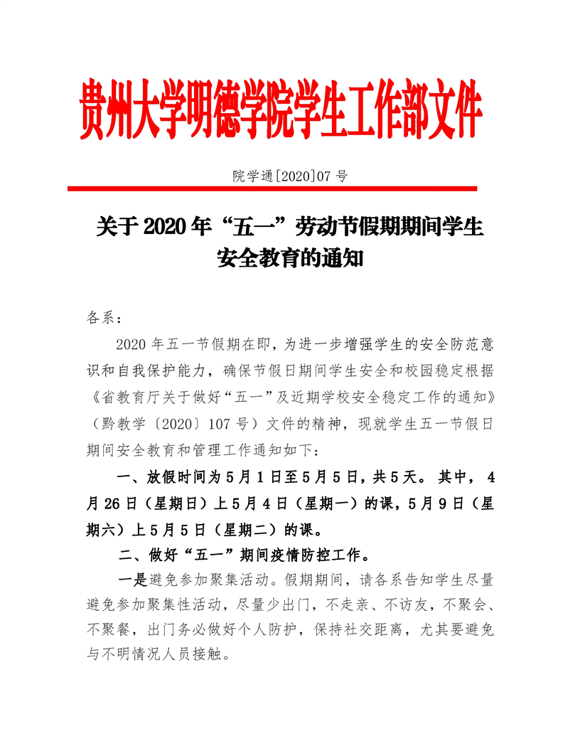 关于 2020 年“五一”劳动节假期期间学生安全教育的通知