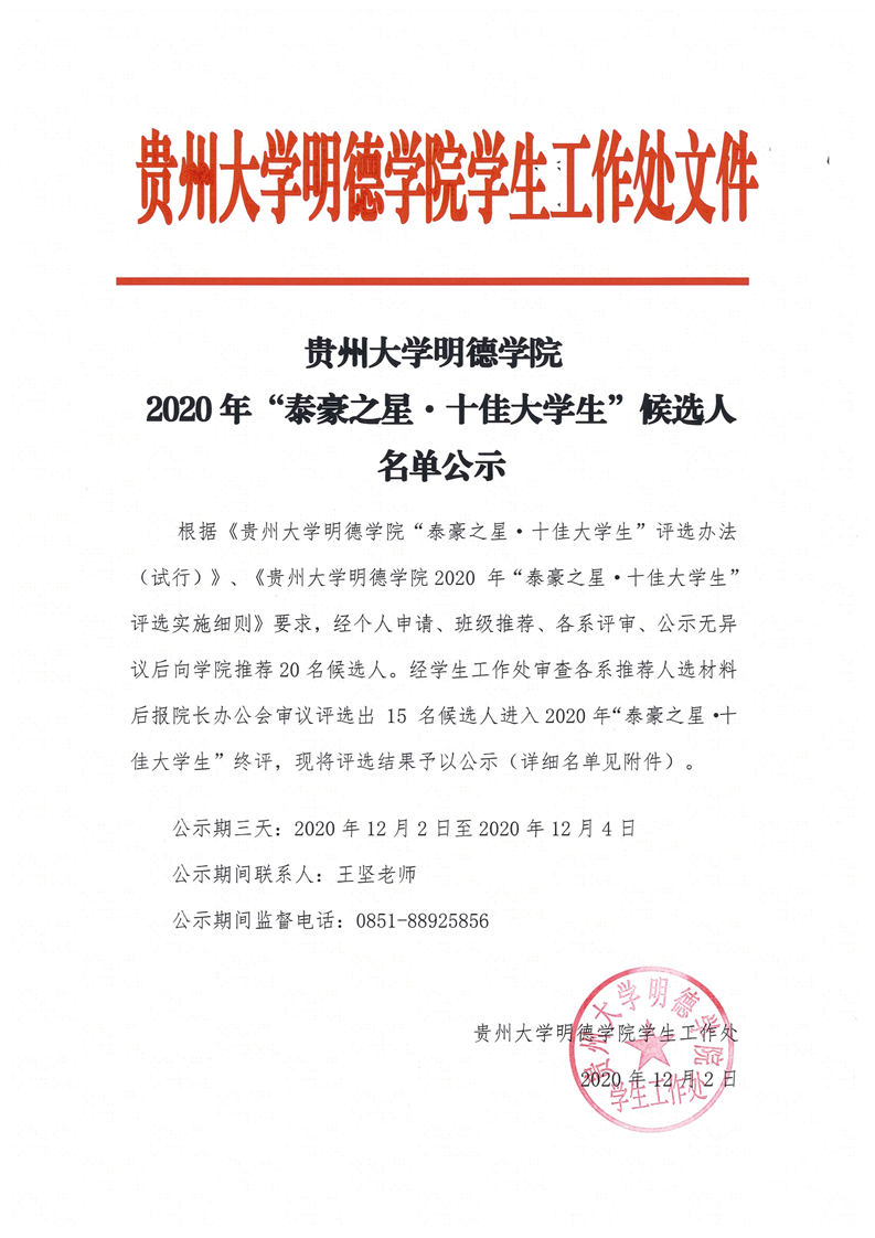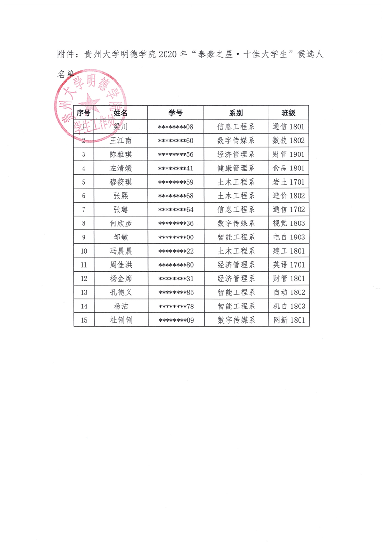 贵州大学明德学院2020年“泰豪之星·十佳大学生”候选人名单公示