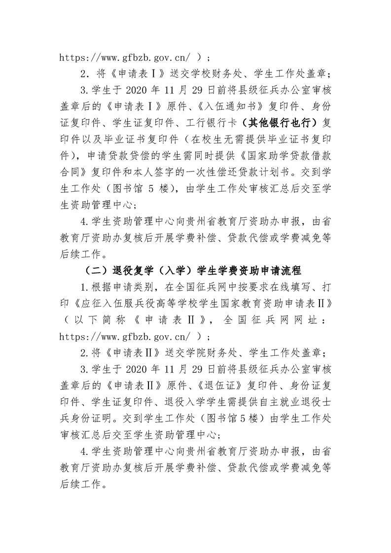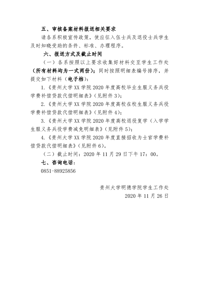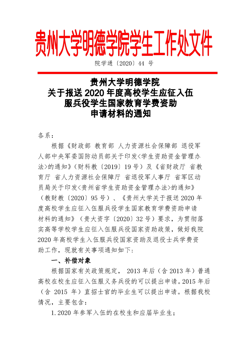 贵州大学明德学院关于报送2020年度高校学生应征入伍服兵役学生国家教育学费资助申请材料的通知