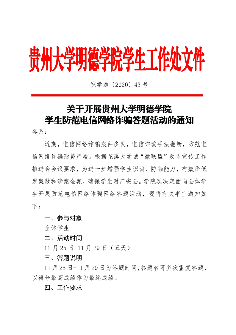 关于开展贵州大学明德学院学生防范电信网络诈骗答题活动的通知