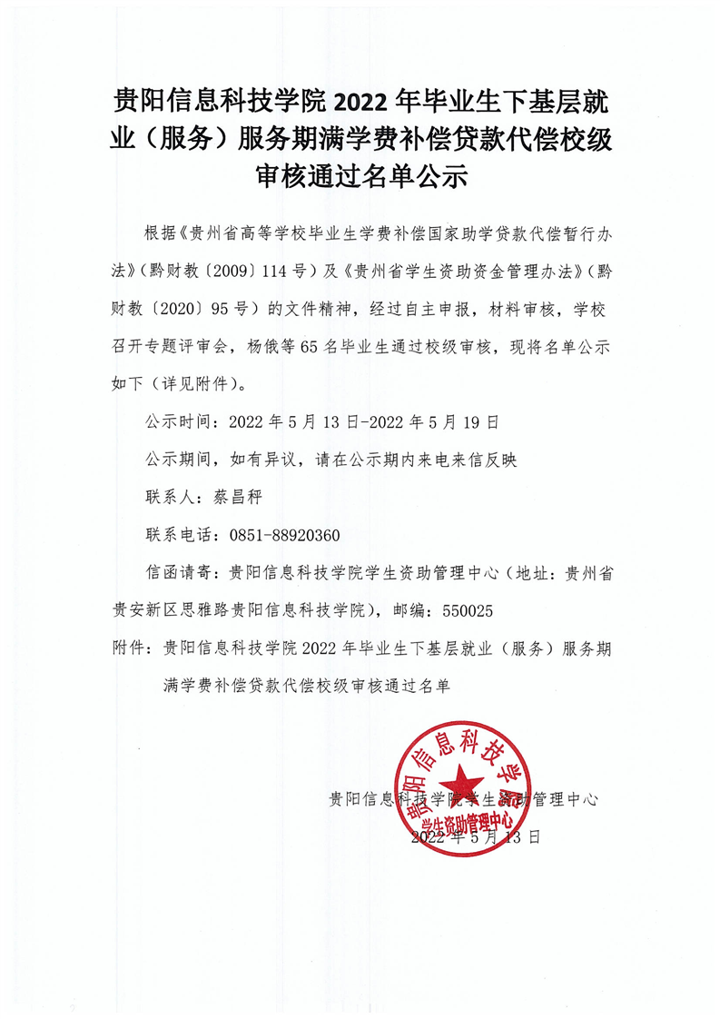 BV伟德中国官方网站2022年毕业生下基层就业(服务)服务期满学费补偿贷款代偿校级审核通过名单公示