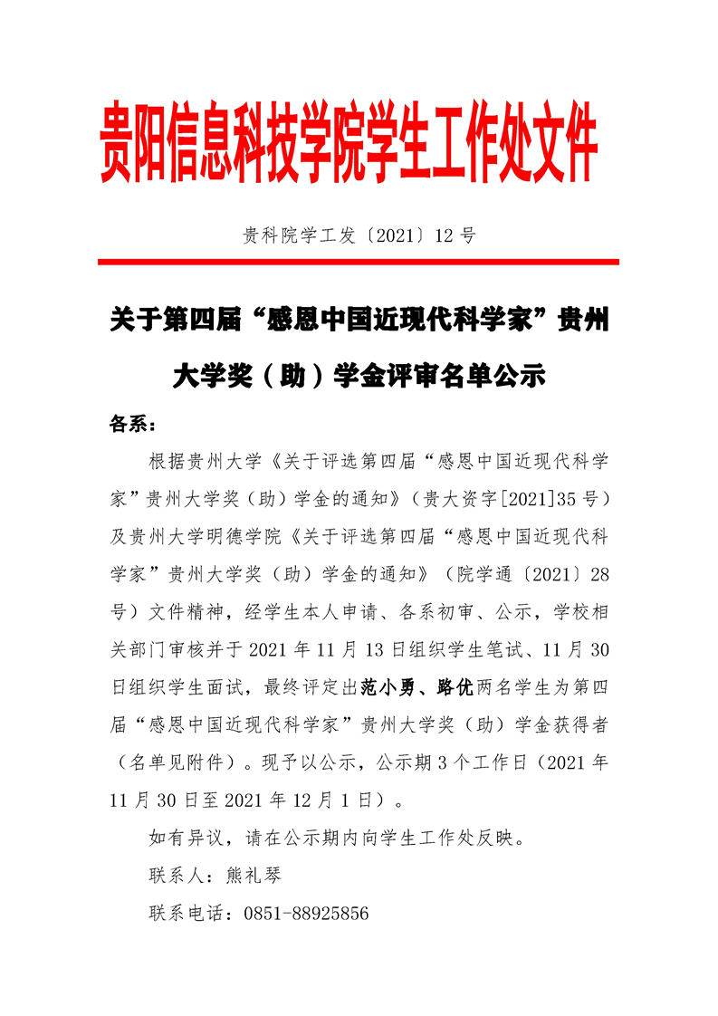 关于第四届“感恩中国近现代科学家”贵州大学奖(助)学金评审名单公示