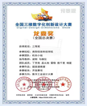 全国三维数字化创新设计大赛(Digital-Design-Dimensions Show,简称:3D大赛,3DDS或3DShow)先后由国家科技部、工信部、教育部、中国科协等部门指导,由国家制造业信息化培训中心等单位主办,已成为全国规模最大、规格最高、水平最强、影响最广的全国大型公益品牌赛事与“数字化+创新创造”行业盛会,已被教育部列入全国高校学科评估体系,是全国普通高校大学生竞赛榜单内竞赛项目之一。在第十六届全国三维数字化创新设计大赛中,自2023上半年启动以来,通过大赛初评、复评及线下决赛,由伟德官网智能工程系梁刚、马雄位老师指导的参赛团队在贵州赛区决赛中获特等奖1项、二等奖1项;全国总决赛中获国赛三等奖1项。