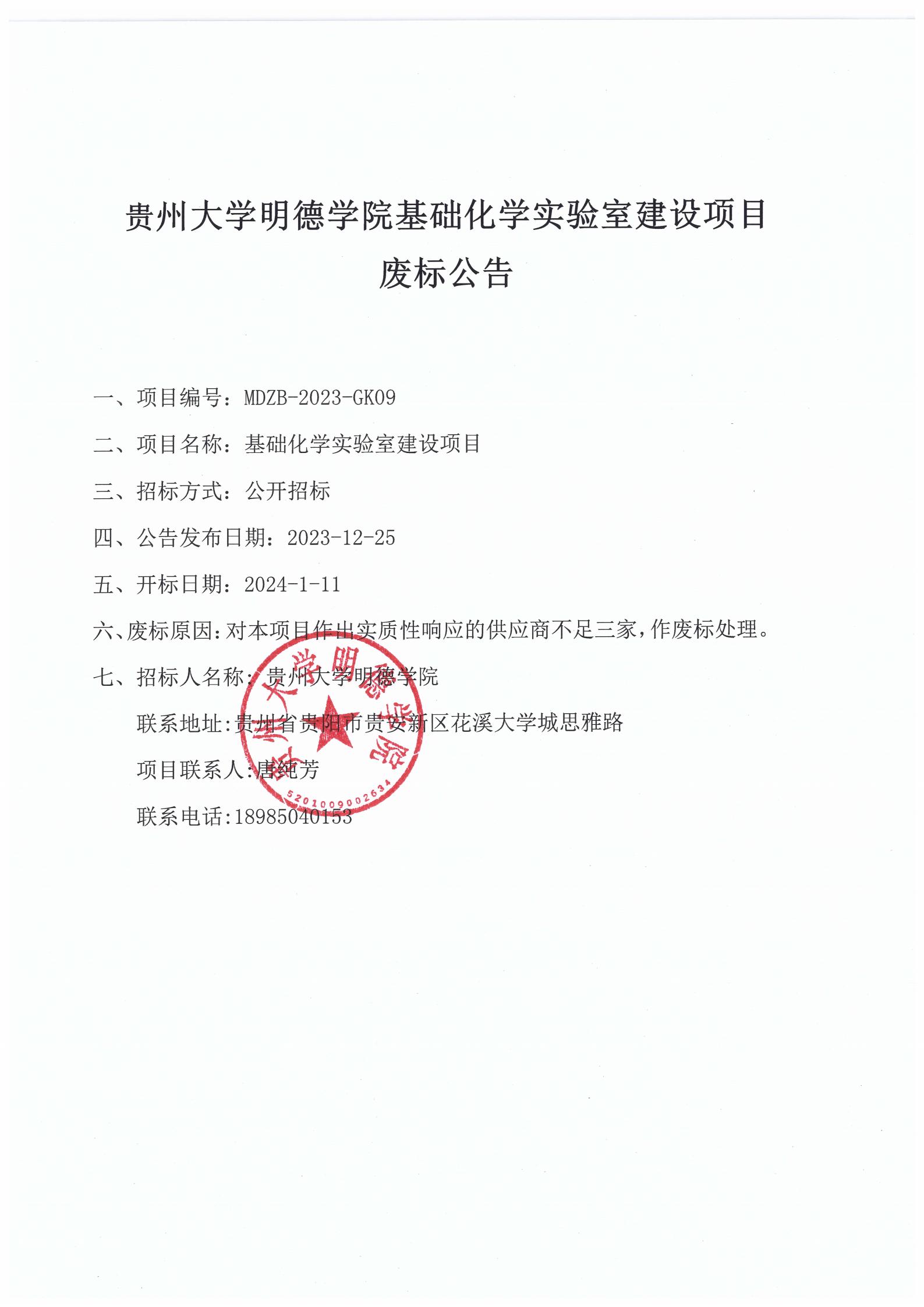 贵州大学明德学院基础化学实验室建设项目废标公告