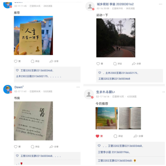通过审议小组的对打卡数据的监测统计,此次活动累计打卡约1500次,累计获赞已超过3000次,累计评论超过1000次,并分别评出了一等奖为工管2202王静,二等奖分别为工管2201代露露、城规2001李益、工管2301李小丽,三等奖分别为建筑2301叶如意、地信2301王丽娜、土木2201阮娴芝、土木2302王璐、城规2301唐武梅,优秀参与者15名。