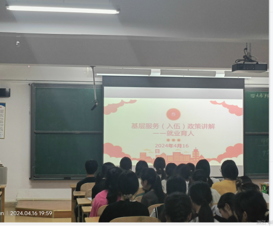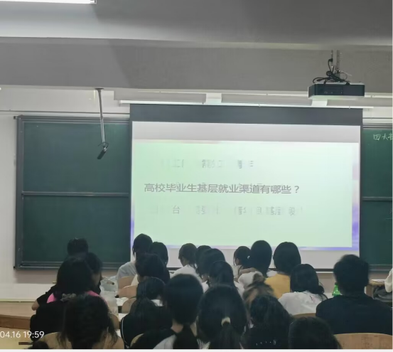活动伊始,我院党总支书记肖蕊从基层工作急需知识青年、国家战略需要大批的基层人才、国家治理需要知识青年到基层锻炼为切入点,从三个大的方面给同学们讲解了相关的知识。接着给同学们讲到了三支一扶、西部计划、特岗教师等基层就业岗位的相关政策和要求。为根植有志青年学生参军入伍想法,肖蕊老师从报名时间、入伍条件等方面的出发,并以参军五笔账——前途账、经济账、阅历账、人脉账、荣誉账为辅助,二者相互交织,得以深入。