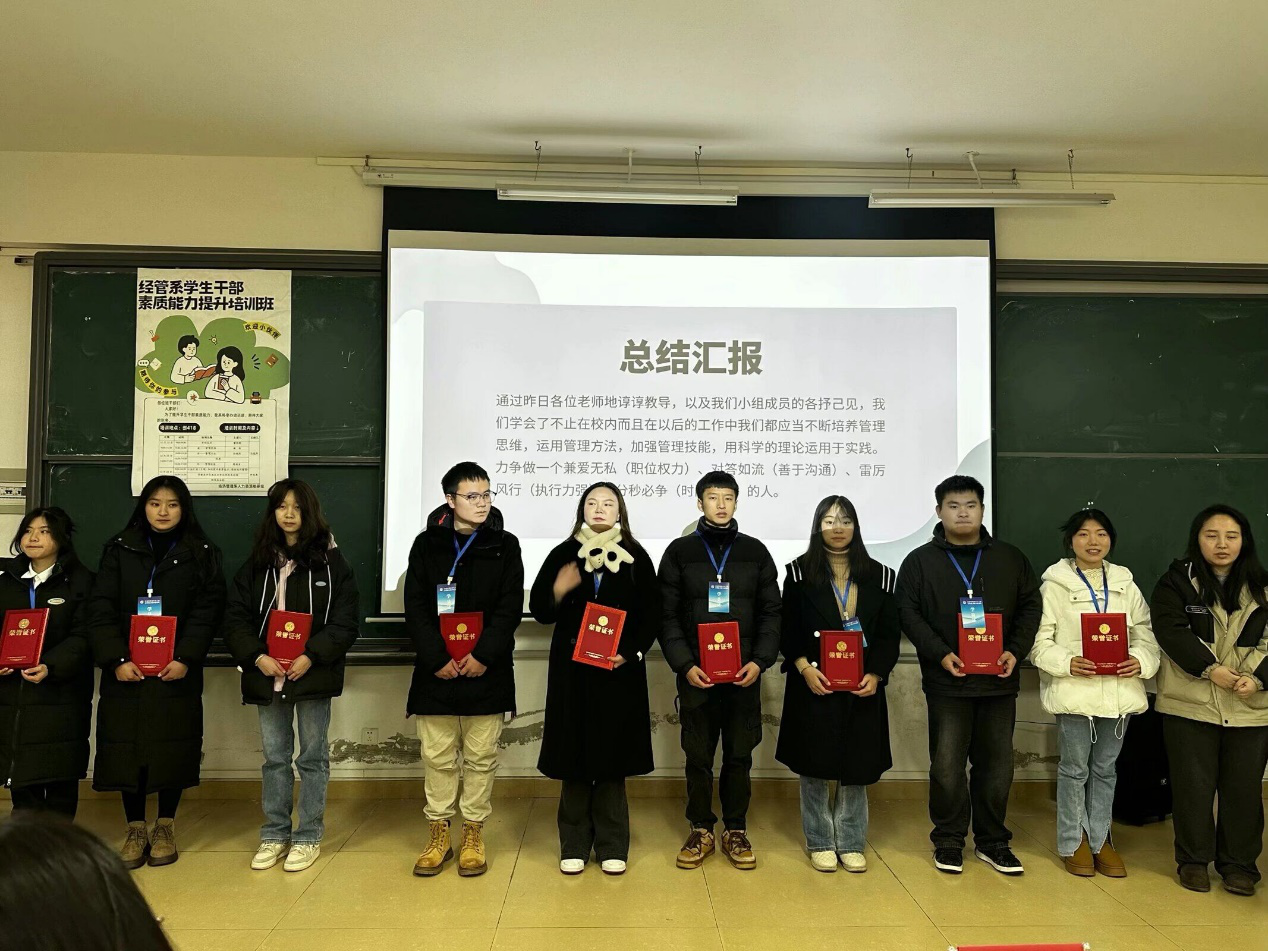 24日上午,小组汇报环节由九组人员通过抽签形式,依次对本次培训成果进行展示,就能力提升方法、学习经验分析及问题改进等方面向评委及同学陈述,辅之以幻灯片、视频短片、演讲等形式全面展示小组学习成果。经角逐,本次汇报共产生三组优秀团队及郑颖竹、曾令增等9名优秀学员,并由经济管理系党总支书记朱成龙及系办主任韦雅菁为获奖团队和优秀学员颁发荣誉证书。