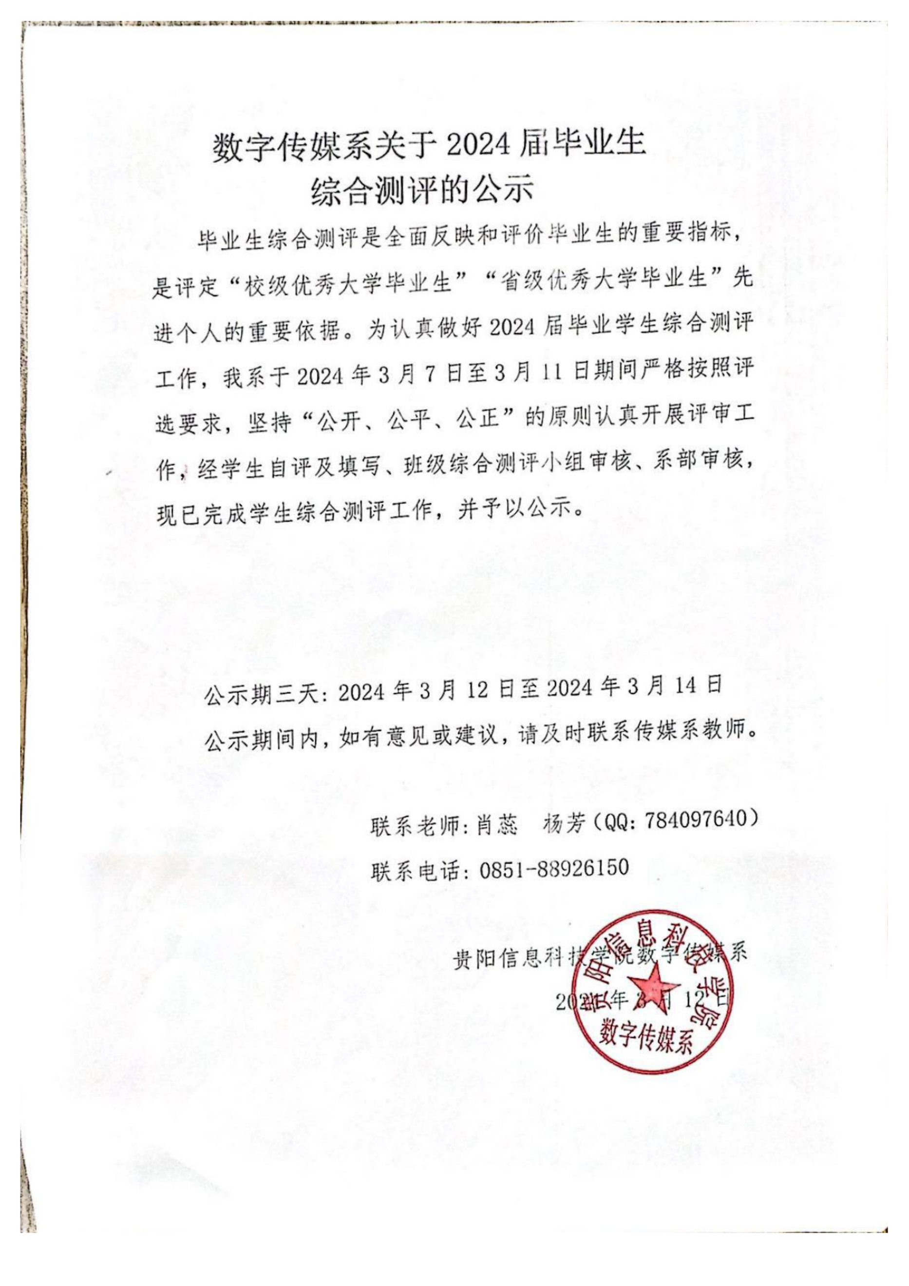数字传媒学院关于2024届优秀毕业生评选拟推荐名单的公示