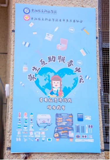 在互助中心有着各种各样的工具、器材可以在大家有需要时为大家提供帮助。例如,突然而至的雨天,互助中心黑色简洁的雨伞静候你的出现;球场上挥汗如雨时没刹住车,互助中心的医药箱和工作人员也乐于帮助你;腿脚受伤不便,互助中心的轮椅、腋杖愿意助你前行!