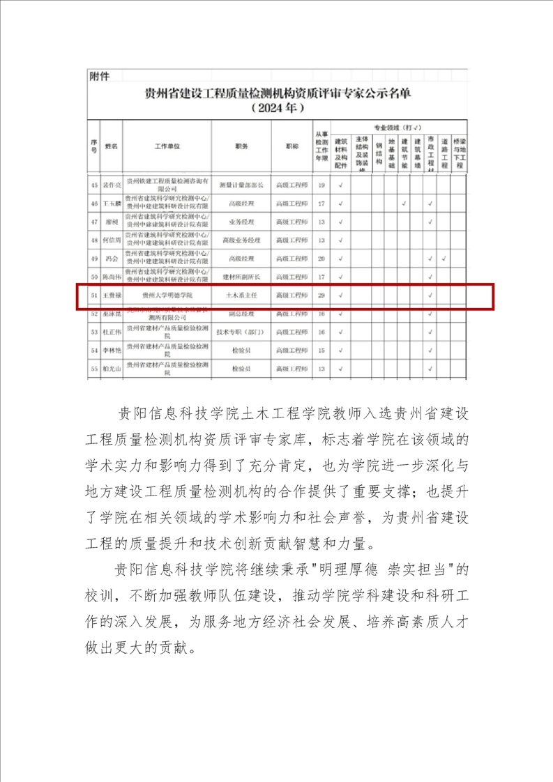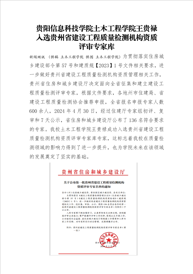 BV伟德中国官方网站土木工程学院王贵禄 入选贵州省建设工程质量检测机构资质 评审专家库