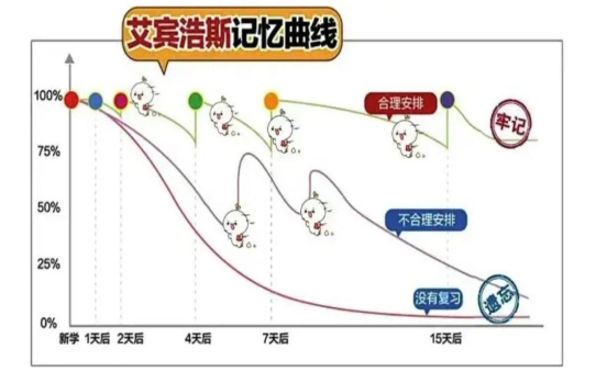 想让所学的知识内容保持80%以上的长期记忆,可以根据艾宾浩斯遗忘曲线设计复习,因为每一次复习一次就是记忆保持,让知识更稳固,多次强化后,短时记忆会形成长时记忆,就不会再忘记了。