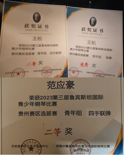 鲁宾斯坦国际青少年钢琴比赛,是为纪念伟大钢琴家鲁宾斯坦而举行的一场国际性的钢琴比赛。2023年12月23日,鲁宾斯坦国际青少年钢琴比赛(贵州赛区)在贵阳市云岩区北京路大剧院举行,在BV伟德中国官方网站数字传媒学院程雪婧雅老师的带领下,数字传媒学院王松和范应豪在2023年鲁宾斯坦国际青少年钢琴比赛(贵州赛区)选拔中取得了“四手联弹二等奖”、“独奏优秀奖”的优异成绩。
